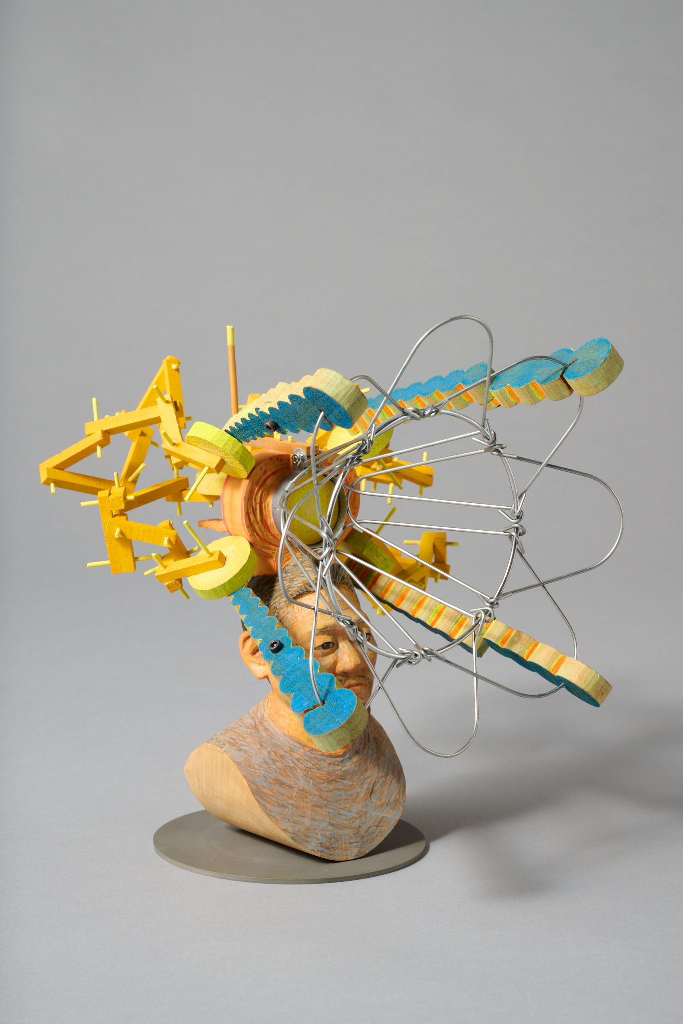 wood (Japanese torreya, gingko, camphor), color pencil, acrylic, stainless steel, iron